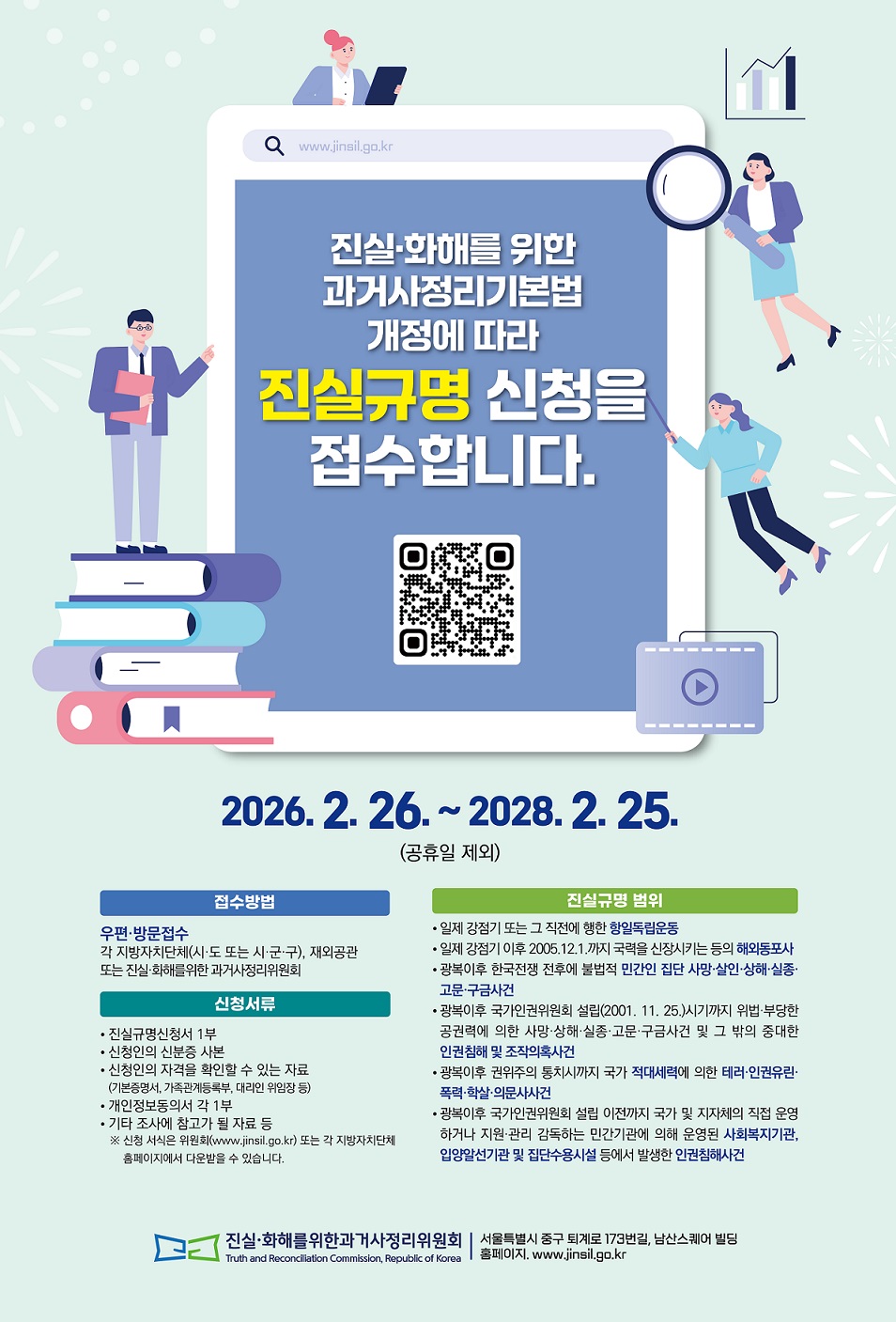 항일독립운동, 일제강점기 이후 국력을 신장시킨 해외동포사, 광복이후 불법적으로 이루어진 민간인 집단 희생사건 및 부당한 공권력의 행사로 인하여 발생한 중대한 인권침해사건과 조작의혹사건 등을 밝히고 과거와의 화해를 통해 국민통합에 기여하기 위하여 제정된 진실·화해를 위한 과거사정리 기본법(이하 “법”)이 2026. 2. 26.부터 시행됨에 따라 법 제 22조의 규정에 의거 진실규명신청을 다음과 같이 접수합니다.